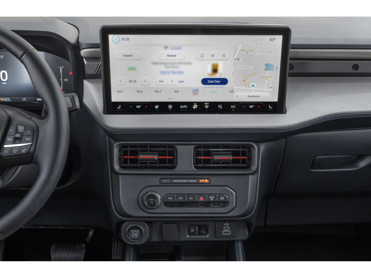 2.91 Axle Ratio, 4-Wheel Disc Brakes, 8 Speakers, ABS brakes, ActiveX Trimmed Heated Front Bucket Seats, Air Conditioning, Alloy wheels, AM/FM radio: SiriusXM with 360L, Apple CarPlay/Android Auto, Auto High-beam Headlights, Automatic temperature control, Brake assist, Bumpers: body-color, Compass, Delay-off headlights, Driver door bin, Driver vanity mirror, Dual front impact airbags, Dual front side impact airbags, Electronic Stability Control, Emergency communication system: SYNC 4 911 Assist, Exterior Parking Camera Rear, Ford Connectivity Package (1-Year Included), Four wheel independent suspension, Front anti-roll bar, Front Bucket Seats, Front Center Armrest, Front dual zone A/C, Front reading lights, Fully automatic headlights, Heated door mirrors, Heated front seats, Heated steering wheel, Illuminated entry, Internet access capable: 5G Modem - Ford Connectivity Package, Knee airbag, Low tire pressure warning, Navigation system: Connected Navigation, Occupant sensing airbag, Outside temperature display, Overhead airbag, Overhead console, Panic alarm, Passenger door bin, Passenger vanity mirror, Power door mirrors, Power driver seat, Power steering, Power windows, Radio data system, Radio: B&O Sound System by Bang and Olufsen, Rear anti-roll bar, Rear seat center armrest, Rear step bumper, Remote keyless entry, Security system, SiriusXM with 360L, Speed control, Speed-sensing steering, Steering wheel mounted audio controls, SYNC 4 with Enhanced Voice Recognition, Telescoping steering wheel, Tilt steering wheel, Traction control, Trip computer, Wheels: 19 Machined Aluminum Painted.