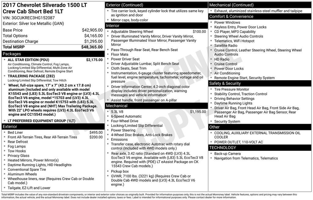 6-Speed Automatic Electronic with Overdrive, 4WD, Jet Black Cloth, 10-Way Power Driver's Seat Adjuster, 110-Volt AC Power Outlet, 150 Amp Alternator, 4-Wheel Disc Brakes, 4.2 Diagonal Color Display Driver Info Center, 40/20/40 Front Split Bench Seat, 6 Speaker Audio System, 6 Speakers, ABS brakes, Air Conditioning, All Star Edition, Alloy wheels, AM/FM radio: SiriusXM, Auxiliary External Transmission Oil Cooler, Bluetooth® For Phone, Body Color Bodyside Moldings, Body-Color Door Handles, Body-Color Mirror Caps, Body-Color Power Adjustable Heated Outside Mirrors, Bodyside moldings, Brake assist, CD player, Cloth Seat Trim, Color-Keyed Carpeting w/Rubberized Vinyl Floor Mats, Compass, Deep-Tinted Glass, Delay-off headlights, Driver & Front Passenger Illuminated Vanity Mirrors, Driver door bin, Driver vanity mirror, Dual front impact airbags, Dual front side impact airbags, Dual-Zone Automatic Climate Control, Electric Rear-Window Defogger, Electronic Stability Control, Emergency communication system: OnStar Guidance, Exterior Parking Camera Rear, EZ Lift & Lower Tailgate, Front anti-roll bar, Front Center Armrest w/Storage, Front Chrome Bumper, Front reading lights, Front wheel independent suspension, Fully automatic headlights, HD Radio, Heated door mirrors, Heavy-Duty Rear Locking Differential, High-Intensity Discharge Headlights, Illuminated entry, Leather Wrapped Steering Wheel w/Cruise Controls, Low tire pressure warning, Manual Tilt Wheel Steering Column, Manual Tilt/Telescoping Steering Column, Occupant sensing airbag, OnStar 3 Months Guidance Plan, OnStar w/4G LTE, Outside temperature display, Overhead airbag, Overhead console, Panic alarm, Passenger door bin, Passenger vanity mirror, Power door mirrors, Power steering, Power windows, Power Windows w/Driver Express Up, Premium audio system: Chevrolet MyLink, Radio data system, Radio: AM/FM 8 Diagonal Color Touch Screen, Rear 60/40 Folding Bench Seat (Folds Up), Rear Chrome Bumper, Rear reading lights, Rear seat center armrest, Rear step bumper, Rear Vision Camera, Rear Wheelhouse Liners, Remote Keyless Entry, Remote keyless entry, Remote Locking Tailgate, Remote Vehicle Starter System, Single Slot CD/MP3 Player, SiriusXM Satellite Radio, Speed control, Speed-sensing steering, Split folding rear seat, Spray-On Pickup Box Bed Liner, Steering Wheel Audio Controls, Steering wheel mounted audio controls, Tachometer, Theft Deterrent System (Unauthorized Entry), Thin Profile LED Fog Lamps, Tilt steering wheel, Traction control, Trailering Package, Trip computer, Variably intermittent wipers, Voltmeter, 6-Speed Automatic Electronic with Overdrive, 4WD, Jet Black Cloth.
