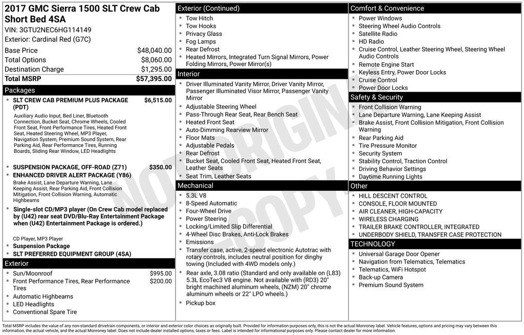 8-Speed Automatic with Overdrive, 4WD, Cocoa/Dune Leather, 10-Way Power Driver's Seat Adjuster, 110-Volt AC Power Outlet, 150 Amp Alternator, 1st & 2nd Row Color-Keyed Carpeted Floor Mats, 2-Speed Active Electronic AutoTrac Transfer Case, 20 x 9 Chrome Clad Aluminum Wheels, 4-Wheel Disc Brakes, 4.2 Diagonal Color Display Driver Info Center, 40/20/40 Front Split Bench Seat, 6 Speakers, 6-Speaker Audio System, 6 Rectangular Chromed Tubular Assist Steps, ABS brakes, Adjustable pedals, Air Conditioning, Alloy wheels, AM/FM radio, Auto-dimming door mirrors, Auto-Dimming Inside Rear-View Mirror, Auto-dimming Rear-View mirror, Automatic temperature control, Auxiliary External Transmission Oil Cooler, Bodyside moldings, Brake assist, Bumpers: chrome, CD player, Chrome Bodyside Moldings, Chrome Door Handles, Chrome Mirror Caps, Color-Keyed Carpeting, Compass, Deep-Tinted Glass, Delay-off headlights, Driver & Front Passenger Illuminated Vanity Mirrors, Driver door bin, Driver vanity mirror, Dual front impact airbags, Dual front side impact airbags, Dual-Zone Automatic Climate Control, Electric Rear-Window Defogger, Electronic Stability Control, Emergency communication system: OnStar Guidance, Enhanced Driver Alert Package, Exterior Parking Camera Rear, EZ Lift & Lower Tailgate, Floor Mounted Console, Forward Collision Alert, Front anti-roll bar, Front Center Armrest w/Storage, Front dual zone A/C, Front fog lights, Front Frame-Mounted Black Recovery Hooks, Front Full Feature Power Reclining Bucket Seats, Front reading lights, Front wheel independent suspension, Fully automatic headlights, Garage door transmitter: HomeLink, HD Radio, Heated & Ventilated Front Bucket Seats, Heated door mirrors, Heated Driver & Front Passenger Seats, Heated front seats, Heavy Duty Suspension, Heavy-Duty Rear Locking Differential, High-Intensity Discharge Headlights, High-Performance LED Headlamps, Hill Descent Control, Illuminated entry, Integrated Trailer Brake Controller, IntelliBeam Automatic High Beam On/Off Headlight, Lane Keep Assist, Leather Appointed Seat Trim, Leather Wrapped Heated Steering Wheel, Leather Wrapped Steering Wheel w/Cruise Controls, LED Cargo Box Lighting, LED Tailamps w/Signature, Low Speed Forward Automatic Braking, Low tire pressure warning, Manual Tilt/Telescoping Steering Column, Memory seat, Occupant sensing airbag, Off-Road Suspension Package, OnStar 3 Month Guidance Plan, OnStar w/4G LTE, Outside temperature display, Overhead airbag, Overhead console, Panic alarm, Passenger door bin, Passenger vanity mirror, Power Adjustable Pedals, Power door mirrors, Power driver seat, Power Folding & Adjustable Heated Outside Mirrors, Power passenger seat, Power Sliding Rear Window w/Defogger, Power steering, Power Sunroof, Power windows, Power Windows w/Driver Express Up & Down, Preferred Equipment Group 4SA, Radio data system, Radio: AM/FM Stereo w/8 Diagonal Color Touch Nav., Radio: AM/FM Stereo w/8 Diagonal Color Touch Screen, Rear 60/40 Folding Bench Seat (Folds Up), Rear reading lights, Rear seat center armrest, Rear step bumper, Rear Vision Camera, Rear Wheelhouse Liners, Rear window defroster, Remote Keyless Entry, Remote k