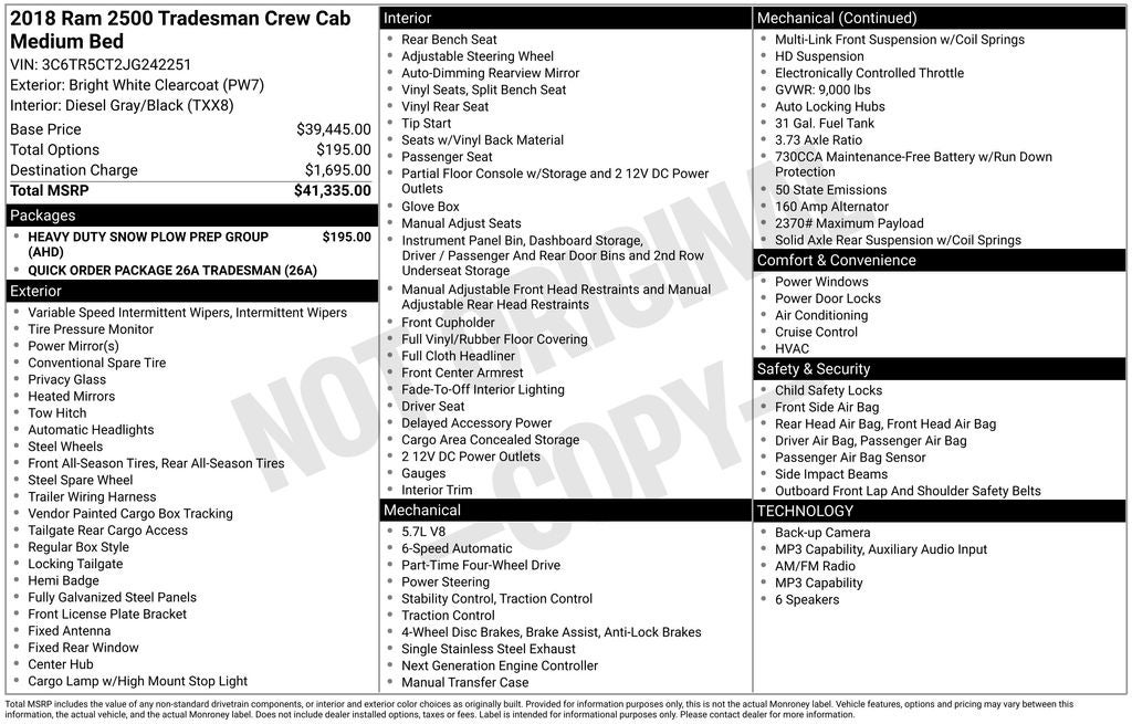 17 x 7.5 Steel Styled Wheels, 180 Amp Alternator, 3.73 Axle Ratio, 4-Wheel Disc Brakes, 40/20/40 Split Bench Seat, 6 Speakers, ABS brakes, Air Conditioning, AM/FM radio, Auto-dimming Rear-View mirror, Black Exterior Mirrors, Brake assist, Center Hub, Delay-off headlights, Driver door bin, Dual front impact airbags, Dual front side impact airbags, Electronic Stability Control, Electronically Controlled Throttle, Exterior Mirrors w/Heating Element, Front anti-roll bar, Front Armrest w/Cupholders, Front Center Armrest, Fully automatic headlights, Heated door mirrors, Heavy Duty Snow Plow Prep Group, Heavy Duty Vinyl 40/20/40 Split Bench Seat, Hemi Badge, Locking Tailgate, Low tire pressure warning, Manual Adjust Seats, Media Hub (USB, AUX), Next Generation Engine Controller, Occupant sensing airbag, Overhead airbag, ParkView Rear Back-Up Camera, Passenger door bin, Power door mirrors, Power steering, Power windows, Quick Order Package 26A Tradesman, Radio data system, Radio: 3.0, Rear Folding Seat, Rear step bumper, Speed control, Tachometer, Tilt steering wheel, Tip Start, Traction control, Variably intermittent wipers, Vendor Painted Cargo Box Tracking, Voltmeter.