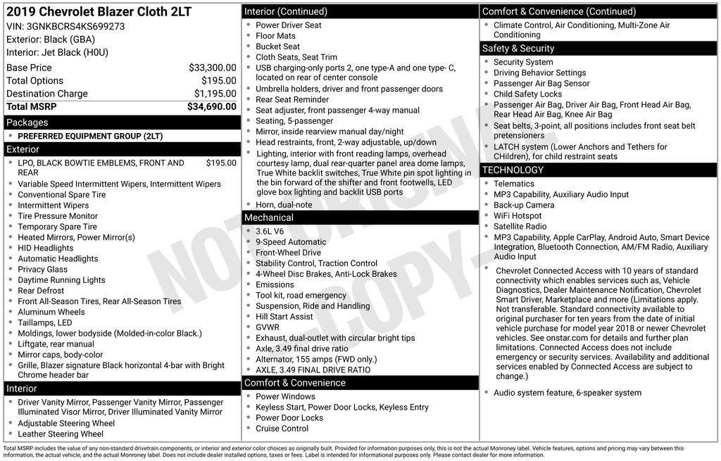 Black 2019 Chevrolet 4D Sport Utility Blazer 2LT 3.6L V6 SIDI DOHC VVT FWD