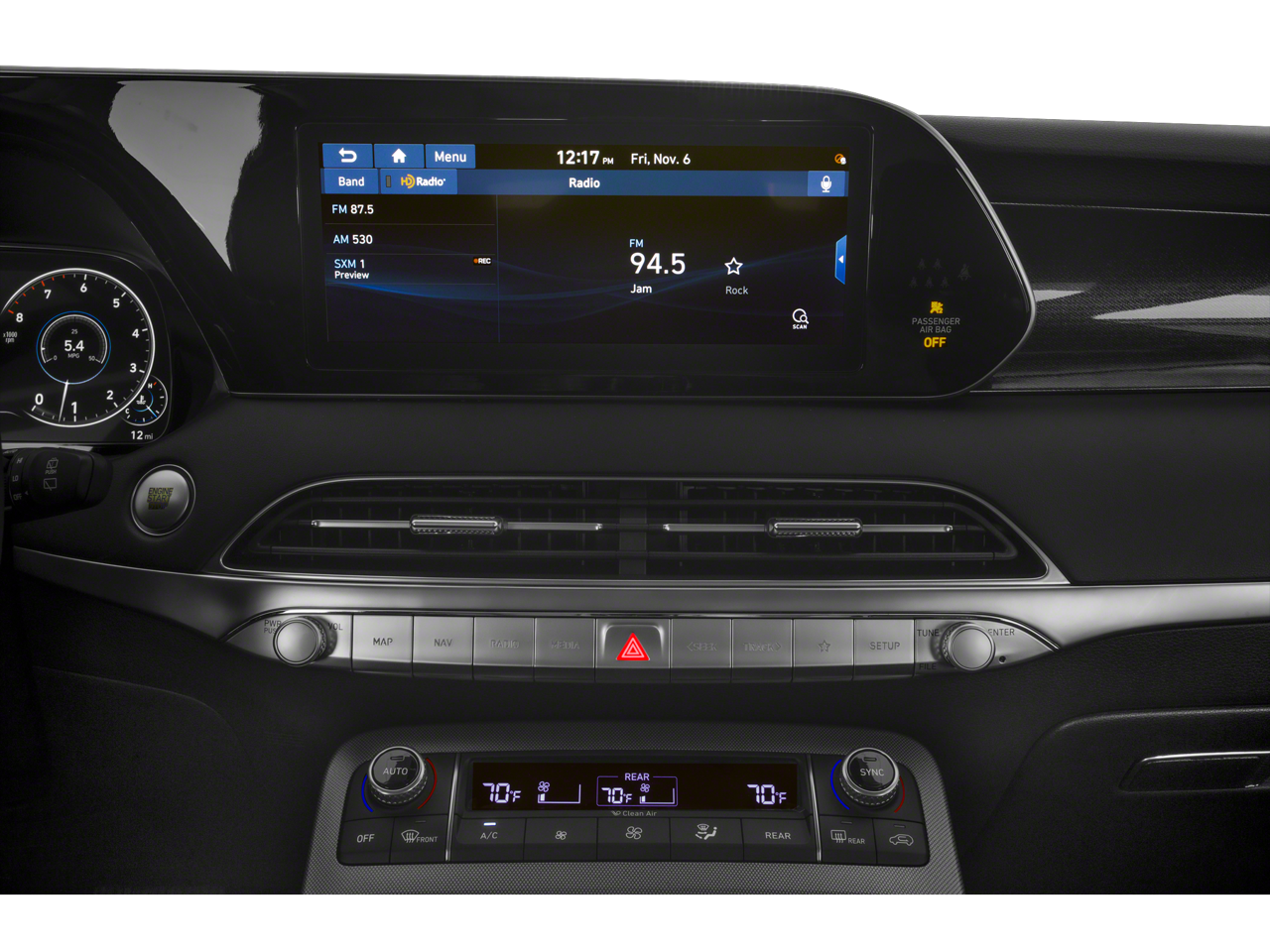 12 Speakers, 3.648 Axle Ratio, 3rd row seats: split-bench, 4-Wheel Disc Brakes, ABS brakes, Air Conditioning, All-Season Fitted Liners, Alloy wheels, AM/FM radio: SiriusXM, Apple CarPlay & Android Auto, Auto High-beam Headlights, Auto-dimming Rear-View mirror, Auto-leveling suspension, Automatic temperature control, Brake assist, Bumper Applique, Bumpers: body-color, Cargo Cover/Screen, Cargo Net, Cargo Tray, Carpeted Floor Mats, Compass, Delay-off headlights, Driver door bin, Driver vanity mirror, Dual front impact airbags, Dual front side impact airbags, Electronic Stability Control, Emergency communication system: Blue Link Connected Car Service (3-year complimentary subscription), Four wheel independent suspension, Front anti-roll bar, Front Bucket Seats, Front Center Armrest, Front dual zone A/C, Front reading lights, Fully automatic headlights, Garage door transmitter: HomeLink, harman/kardon® Speakers, Heads-Up Display, Heated & Ventilated Front Bucket Seats, Heated door mirrors, Heated front seats, Heated rear seats, Heated steering wheel, Illuminated entry, Knee airbag, Low tire pressure warning, Memory seat, Mudguards, Navigation System, Occupant sensing airbag, Option Group 01, Outside temperature display, Overhead airbag, Overhead console, Panic alarm, Passenger door bin, Passenger vanity mirror, Power door mirrors, Power driver seat, Power Liftgate, Power moonroof, Power passenger seat, Power steering, Power windows, Premium Nappa Leather Seat Trim, Radio data system, Radio: AM/FM/MP3 Premium Audio System, Rain sensing wipers, Rear air conditioning, Rear anti-roll bar, Rear reading lights, Rear window defroster, Rear window wiper, Reclining 3rd row seat, Remote keyless entry, Security system, Speed control, Speed-sensing steering, Split folding rear seat, Spoiler, Steering wheel mounted audio controls, Tachometer, Telescoping steering wheel, Tilt steering wheel, Traction control, Trip computer, Turn signal indicator mirrors, Variably intermittent wipers, Ventilated front seats, Ventilated rear seats, Wheels: 20 x 7.5J Split 5-Spoke Machined Alloy, Winter Package.