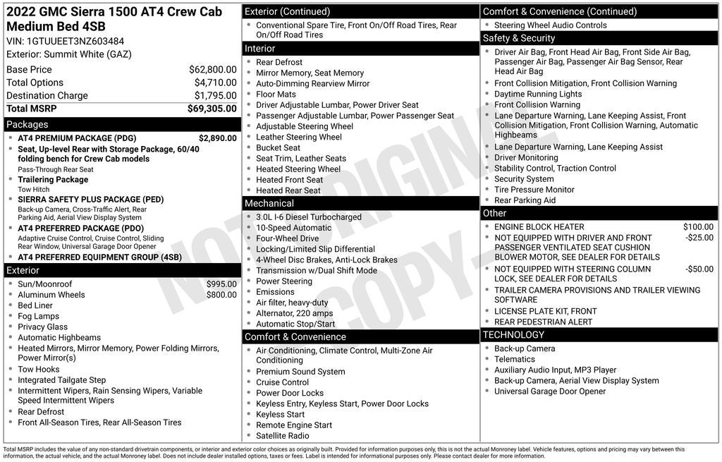 Clean CarFax/No Accidents, Service Records Available, Bluetooth® / Hands-free Calling, Moonroof/Sunroof, Rear BackUp Camera, Leather, Navigation GPS, 4WD / 4 Wheel Drive, Non Smoker, Heated Seats, 10-Speed Automatic, 4WD, Jet Black With Kalahari Accents Leather, Adaptive Cruise Control, AT4 Preferred Package, AT4 Premium Package, Off-Road High Clearance Step (LPO), Power Sliding Rear Window w/Rear Defogger, Sierra Safety Plus Package, Universal Home Remote, 10-Way Power Driver Seat Adjuster w/Lumbar, 10-Way Power Passenger Seat Adjuster w/Lumbar, 120-Volt Bed Mounted Power Outlet, 120-Volt Instrument Panel Power Outlet, 18 x 8.5 Machined Aluminum Wheels, 2 Charge/Data USB Ports Inside Center Console, 2 Type-C Charge-Only Rear USB Ports, 2 USB Ports, 220 Amp Alternator, 3.23 Rear Axle Ratio, 4-Wheel Disc Brakes, 7 Speakers, ABS brakes, Air Conditioning, Alloy wheels, AM/FM radio: SiriusXM with 360L, Apple CarPlay/Android Auto, Auto High-beam Headlights, Auto-dimming door mirrors, Auto-dimming Rear-View mirror, Auto-Locking Rear Differential, Automatic Emergency Braking, Automatic temperature control, Black Chrome Header & Grille Insert Bars, Block heater, Brake assist, Buckle to Drive, Bumpers: body-color, Color-Keyed Carpeting Floor Covering, Compass, Deep-Tinted Glass, Delay-off headlights, Driver door bin, Driver Memory, Driver vanity mirror, Dual front impact airbags, Dual front side impact airbags, Electric Rear-Window Defogger, Electrical Steering Column Lock, Electronic Stability Control, Emergency communication system: OnStar and GMC Connected Services capable, Engine Block Heater, Floor-Mounted Center Console, Following Distance Indicator, Forward Collision Alert, Front anti-roll bar, Front Bucket Seats, Front Center Armrest, Front dual zone A/C, Front fog lights, Front License Plate Kit, Front Pedestrian Braking, Front Prem Floor Liners w/Removable Carpet Insert, Front Rainsensing Wipers, Front reading lights, Front wheel independent suspension, Fully automatic headlights, GMC Connected Access Capable, HD Rear Vision Camera, HD Surround Vision, Heated 2nd Row Outboard Seats, Heated door mirrors, Heated Driver & Front Outboard Passenger Seating, Heated front seats, Heated rear seats, Heated Steering Wheel, Heated steering wheel, Heavy-Duty Air Filter, Hill Descent Control, Hitch Guidance, Hitch Guidance w/Hitch View, Illuminated entry, In-Vehicle Trailering App, Integrated Trailer Brake Controller, IntelliBeam Automatic High Beam On/Off, Keyless Open & Start, Lane Keep Assist w/Lane Departure Warning, LED Cargo Area Lighting, Low tire pressure warning, Memory seat, Navigation System, Not Equip w/Heat & Vent Seat Cushion Blower Motor, Not Equipped w/Steering Column Lock, Occupant sensing airbag, Off-Road Suspension, OnStar & GMC Connected Services Capable, Outside temperature display, Overhead airbag, Overhead console, Panic alarm, Passenger door bin, Passenger vanity mirror, Perforated Front Leather Seat Trim, Perimeter Lighting, Power Door Locks, Power door mirrors, Power driver seat, Power Front Passenger Windows w/Express Up/Down, Power Front Win