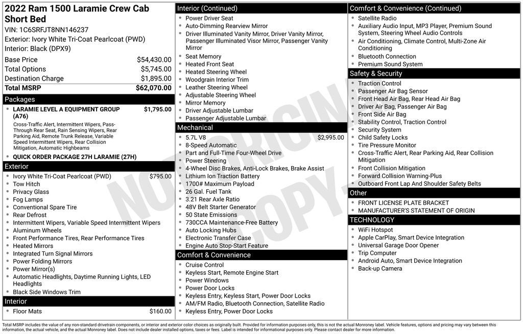 Ivory White Tri-Coat Pearlcoat 2022 Ram 4D Crew Cab 1500 Laramie HEMI 5.7L V8 Multi Displacement VVT 4WD